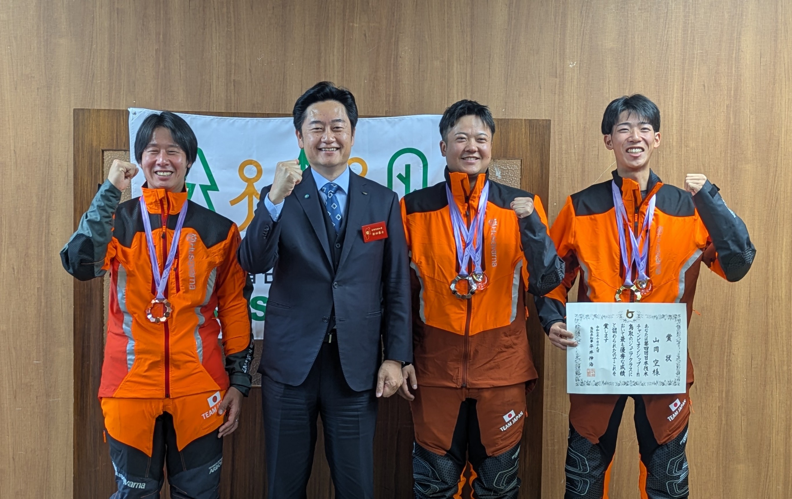 昨年10月に鳥取市で開催された「第4回日本伐木チャンピオンシップin鳥取」で入賞された選手3名(有限会社矢守産業)が、1月14日に新田副知事を表敬訪問しました。